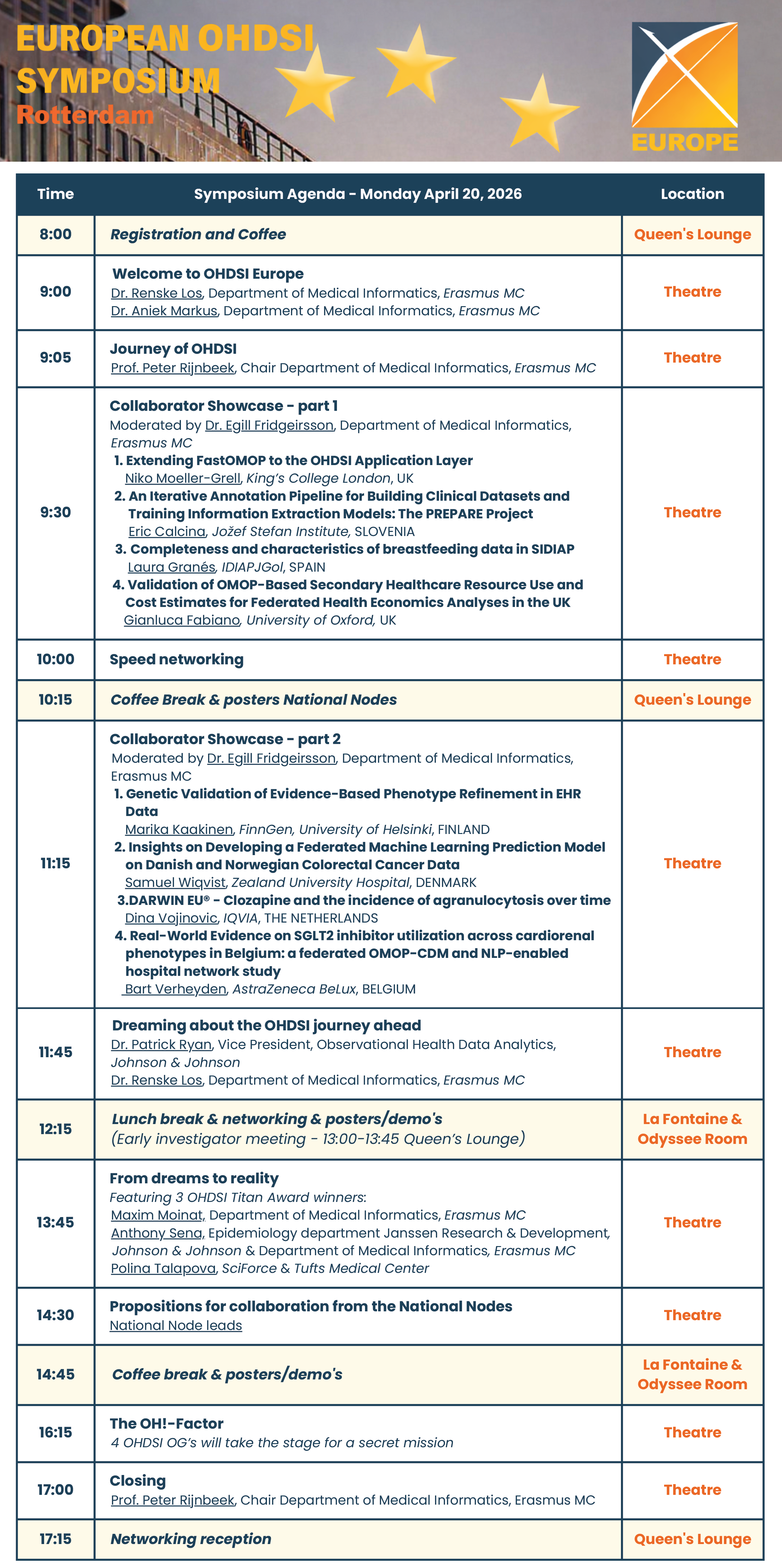 The seventh European OHDSI Symposium Continuous Collaboration for Living Evidence Generation will be held in Rotterdam (NL) on April 20th, 2026, again at an inspiring location, the Steam Ship Rotterdam. The symposium is a platform to share results and ideas about the use of the OMOP-CDM, tool development, and future research. The day will include a collaborator showcase including posters and podium presentations to highlight OHDSI’s research achievements, and interactive demonstrations of OHDSI’s open-source software tools. During the symposium, we will update you on the exciting work being done all over Europe, in National Nodes, large European Projects, and other initiatives. Like last year, we will also reserve a lot of time for networking. We encourage people who are new to OHDSI and are interested to learn more about this exciting initiative to join our Journey. There is a slot reserved for newcomers to meet the experts in one-to-one sessions. The main symposium will take place on Monday, April 20th, 2026 on the ship SS Rotterdam. Saturday, April 18th, and Sunday, April 19th will be dedicated to workshops and workgroup meetings, to be held in the Education Centre of the Erasmus University Medical Center, Rotterdam, The Netherlands. For instructions how to arrive at the SS Rotterdam, please follow this link. For instructions how to arrive at the Erasmus University Medical Center, Rotterdam, please check this file. AgendaWeekend workshops & tutorialsSee the agenda for the interesting and enlightening weekend program through this link. Symposium dayPlease find the exciting agenda for the symposium on Monday April 20th below!
