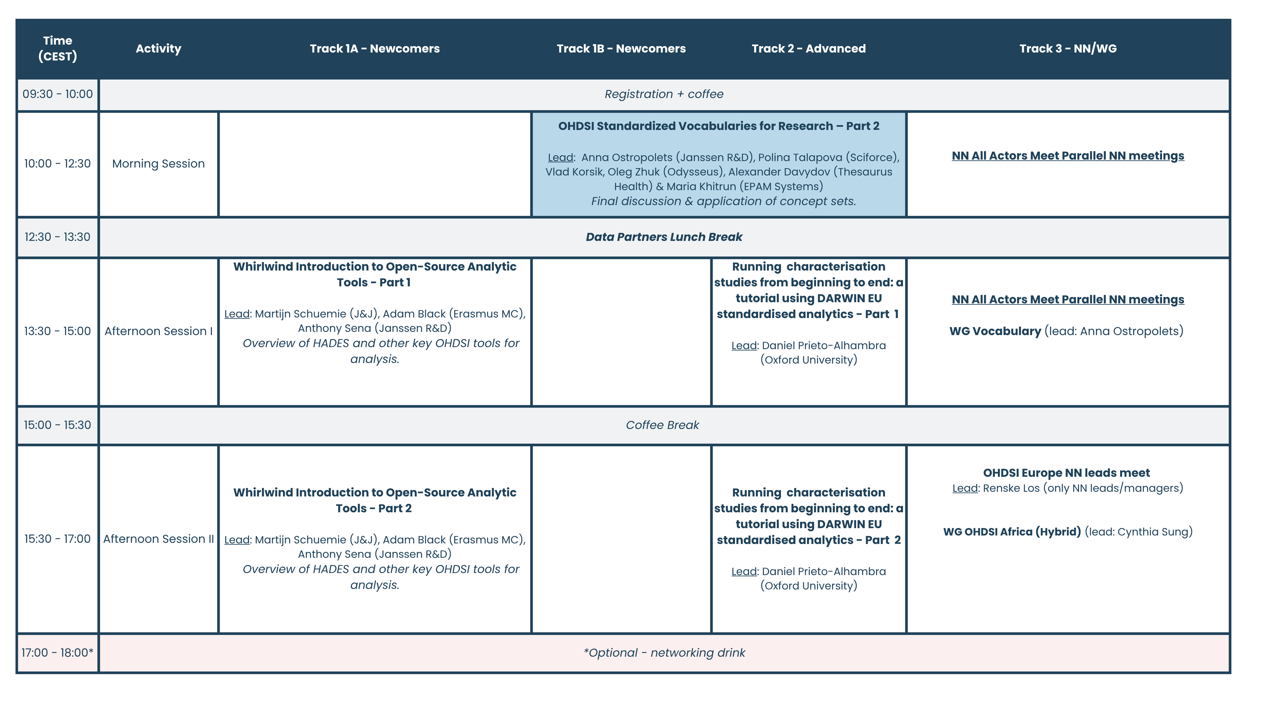 Next to the structured tracks, attendees can join data partner lunches, OHDSI workgroup meetings, National Nodes gatherings, and networking sessions. A HADES hack-a-thon is also confirmed for those looking to dive deeper into tool development.