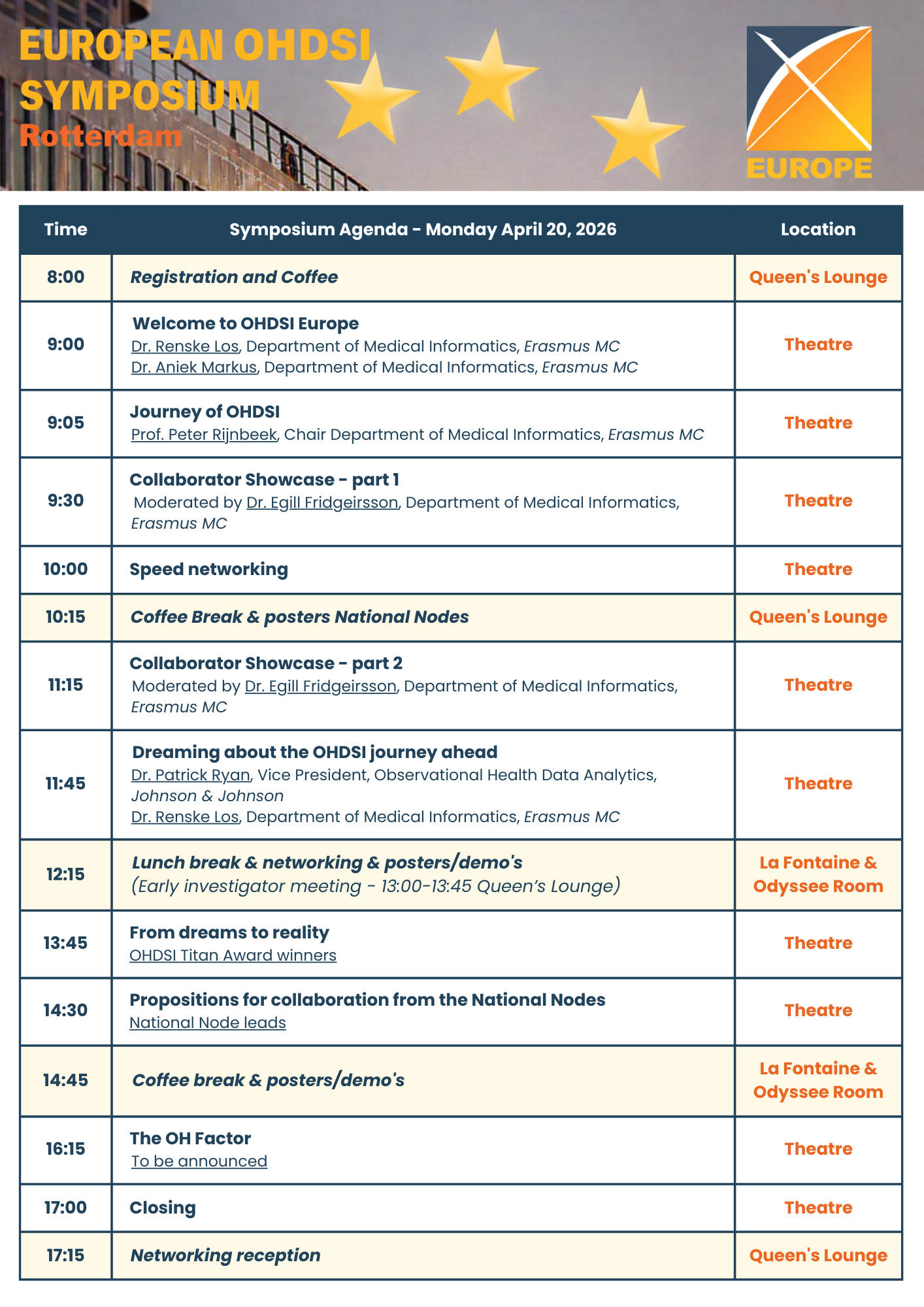 The seventh European OHDSI Symposium Continuous Collaboration for Living Evidence Generation will be held in Rotterdam (NL) on April 20th, 2026, again at an inspiring location, the Steam Ship Rotterdam. The symposium is a platform to share results and ideas about the use of the OMOP-CDM, tool development, and future research. The day will include a collaborator showcase including posters and podium presentations to highlight OHDSI’s research achievements, and interactive demonstrations of OHDSI’s open-source software tools. During the symposium, we will update you on the exciting work being done all over Europe, in National Nodes, large European Projects, and other initiatives. Like last year, we will also reserve a lot of time for networking. We encourage people who are new to OHDSI and are interested to learn more about this exciting initiative to join our Journey. There is a slot reserved for newcomers to meet the experts in one-to-one sessions. The main symposium will take place on Monday, April 20th, 2026 on the ship SS Rotterdam. Saturday, April 18th, and Sunday, April 19th will be dedicated to workshops and workgroup meetings, to be held in the Education Centre of the Erasmus University Medical Center, Rotterdam, The Netherlands. For instructions how to arrive at the SS Rotterdam, please follow this link. For instructions how to arrive at the Erasmus University Medical Center, Rotterdam, please check this file. AgendaPlease find the exciting agenda for the symposium on Monday April 20th below! The list of workshops and workgroup meetings for April 18th and 19th will be uploaded here soon.